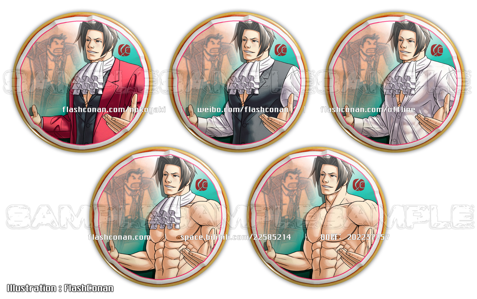 特写徽章为带包装纸铜锣烧的拟态(这样才能用彩图)。而糸锯特写徽章为"糸鋸どら焼き"同名明信片画面的截取。其中糸锯名字注释上还特意加了假名注音,来时刻提醒大家他名字的正确读法。 | ||||||